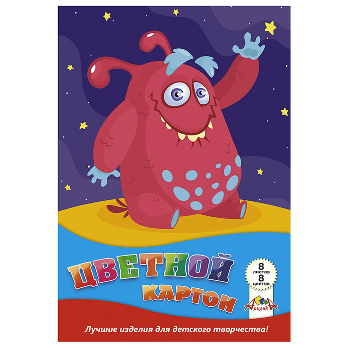 Цветной картон 8 листов, 8 цветов. Формат А4. Внутренний блок изготовлен из немелованного картона. Плотностью 200 гр/м2. Ровные насыщенные цвета: зеленый, фиолетовый, желтый, черный, красный, оранжевый, синий, белый. Упаковка - папка выполнена из мелованного картона.