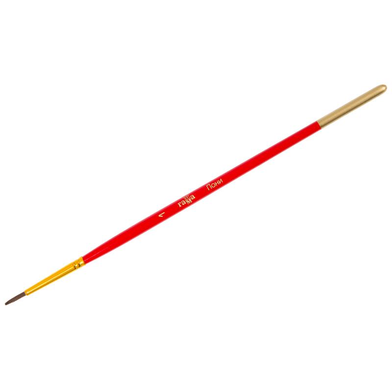 Кисть из волоса Пони, круглая. Волос кисти - средней жёсткости, ближе к мягкому. Волос надежный и долговечный. Идеальны для начинающих художников и детских образовательных учреждениях. Используют для красок: акварель, гуашь. Обойма выполнена из полированного алюминия с золотистым напылением. Ручка изготовлена из качественной древесины березы, покрыта глянцевой эмалью красного цвета.
