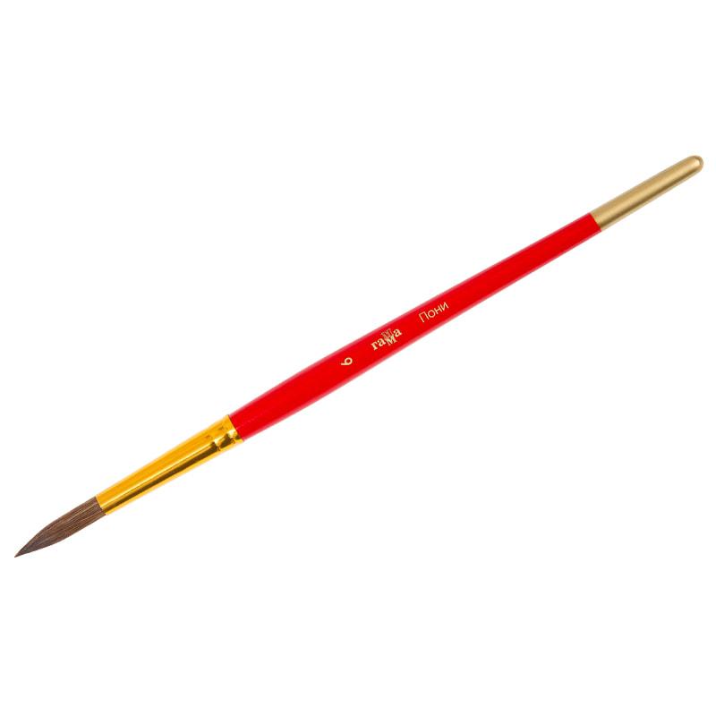 Кисть из волоса Пони, круглая. Волос кисти - средней жёсткости, ближе к мягкому. Волос надежный и долговечный. Идеальны для начинающих художников и детских образовательных учреждениях. Используют для красок: акварель, гуашь. Обойма выполнена из полированного алюминия с золотистым напылением. Ручка изготовлена из качественной древесины березы, покрыта глянцевой эмалью красного цвета.