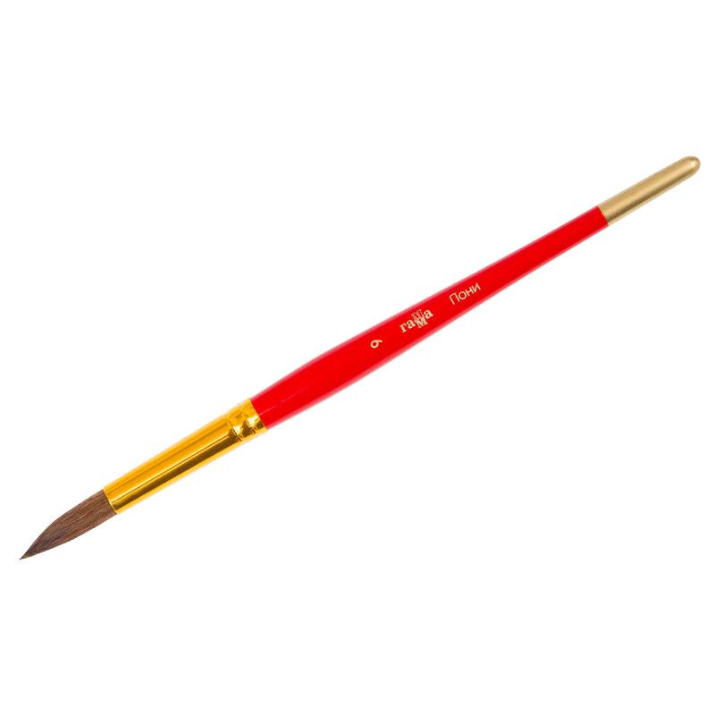 Кисть из волоса Пони, круглая. Волос кисти - средней жёсткости, ближе к мягкому. Волос надежный и долговечный. Идеальны для начинающих художников и детских образовательных учреждениях. Используют для красок: акварель, гуашь. Обойма выполнена из полированного алюминия с золотистым напылением. Ручка изготовлена из качественной древесины березы, покрыта глянцевой эмалью красного цвета.