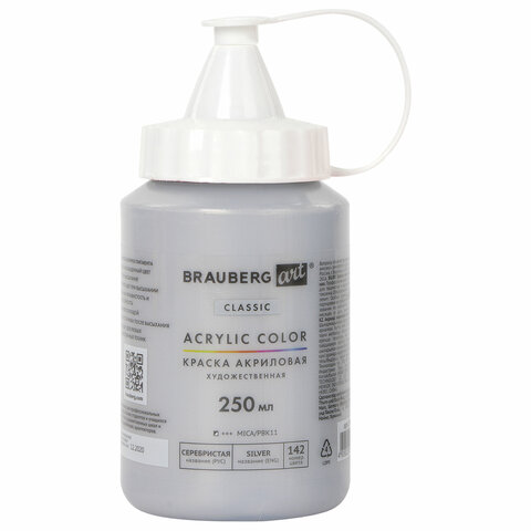 Краска акриловая художественная BRAUBERG ART CLASSIC, флакон 250 мл, СЕРЕБРИСТАЯ, 191715