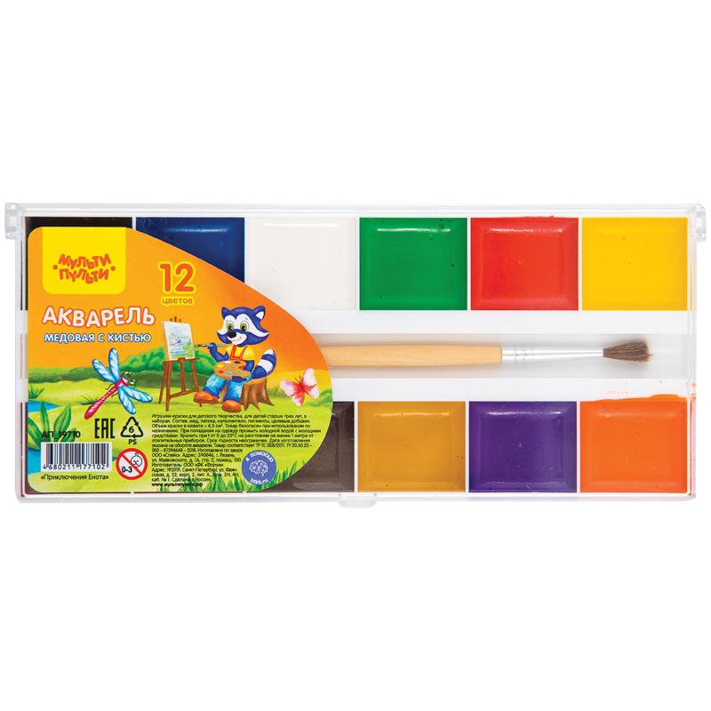 Акварель Мульти-Пульти "Приключения Енота", медовая, 12 цветов, с кистью, пластик АП_19710