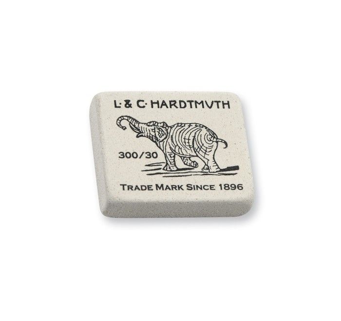 Известный ластик со слоном. Изготовлен из каучука, универсален. Отлично стирает линии графиитовых карандашей любой твердости.