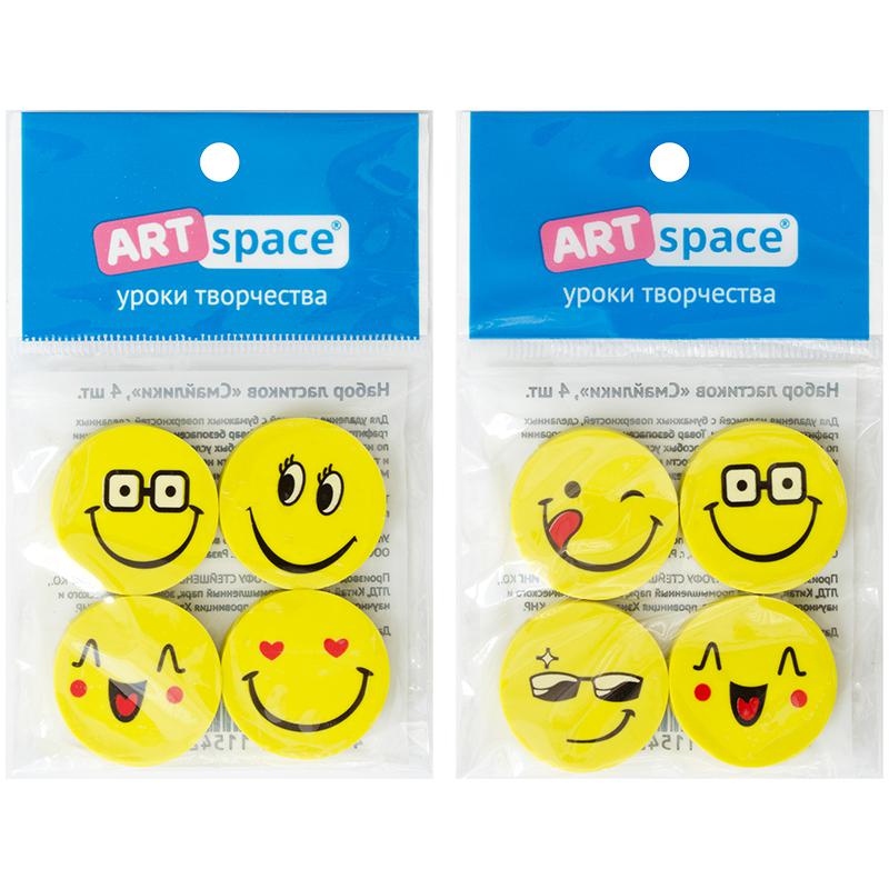 Набор ластиков "Смайлики", 4шт., круглые, термопластичная резина, картонный держатель, 25*5мм: ER-13542 штр.: 4680211115425. Для удаления надписей с бумажных поверхностей, сделанных графитовым карандашом.