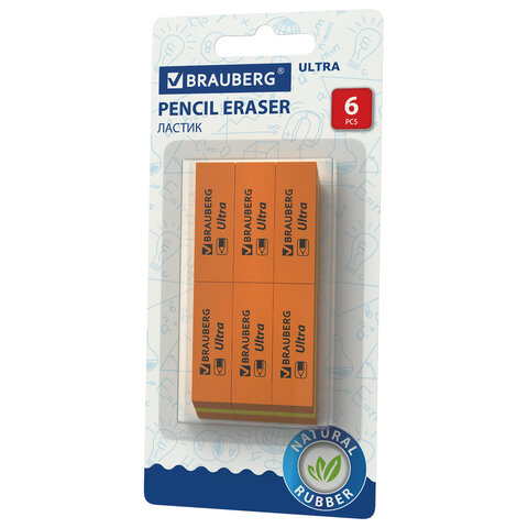 Ластики BRAUBERG "Ultra" НАБОР 6 шт., размер ластика 41х14х8 мм, оранжевые, натуральный каучук, 229601