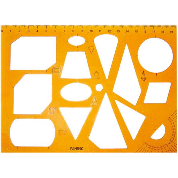 Линейка-трафарет для черчения 10-и плоских и 8-и объёмных геометрических фигур (куб, конус, цилиндр, призма), цветная, прозрачная. Имеет шкалу транспортира. Длина - 19,5 см.
