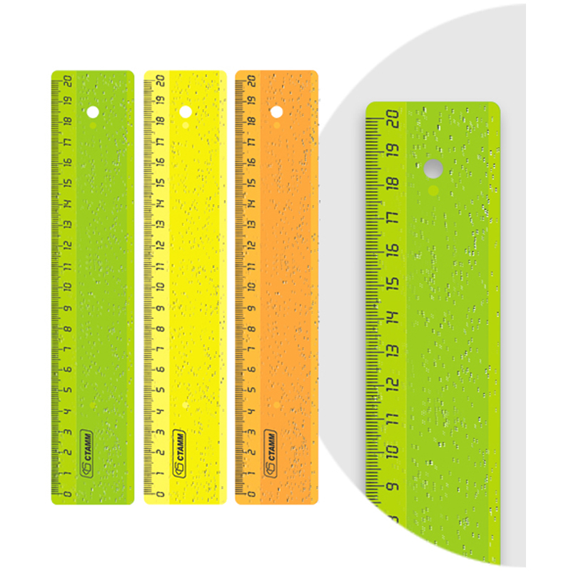 Линейка 20см с ровной чёткой миллиметровой шкалой. Широкая, с гладкой глянцевой поверхностью. 3 ярких неоновых цвета с блёстками. Безопасные закругленные углы. На единице изделия указан штрих-код.
