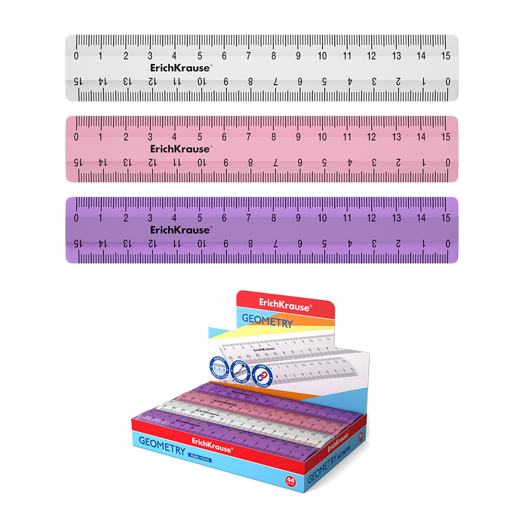 Линейка пластиковая ErichKrause® Candy, 15см, ассорти из 3 цветов, в коробке-дисплее