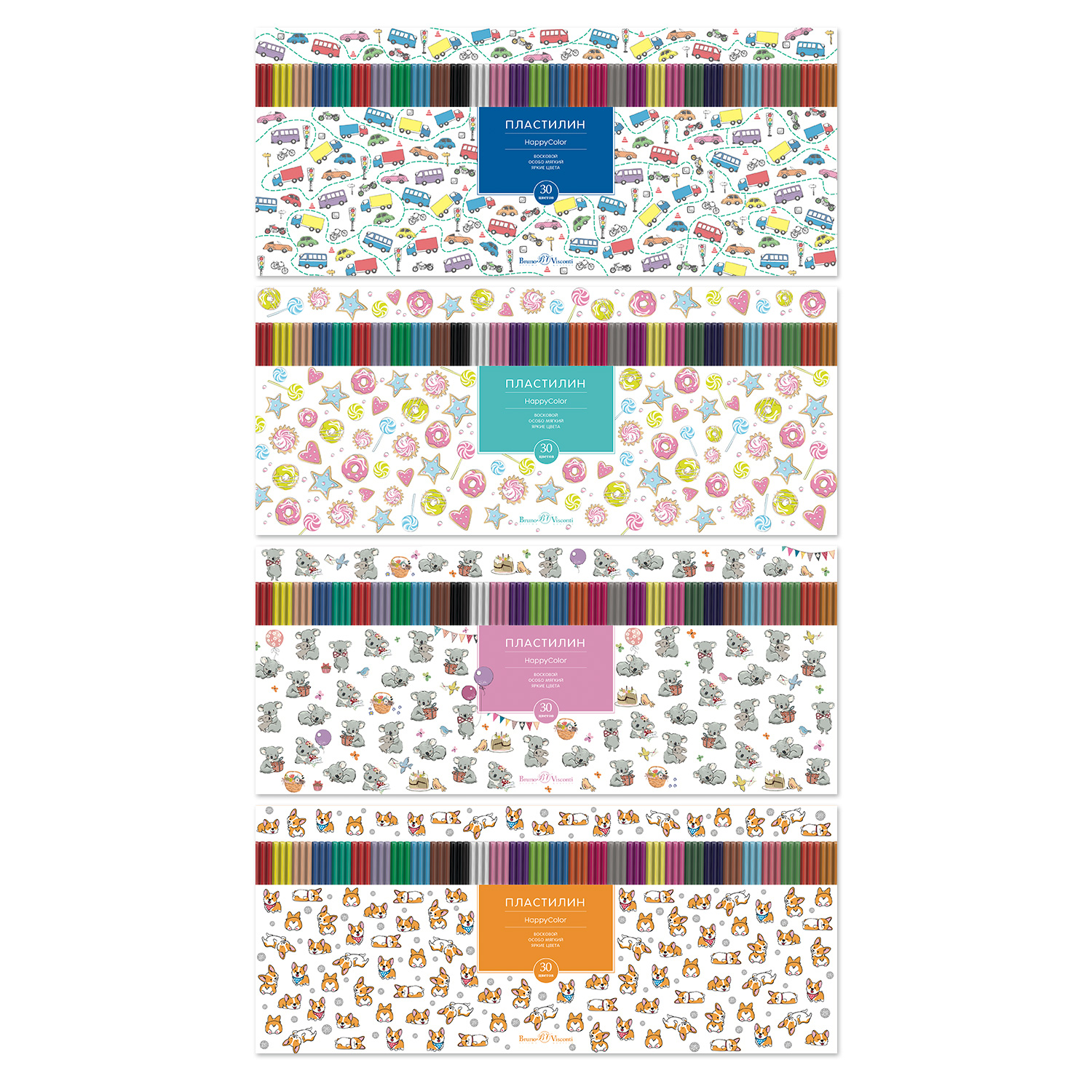 ПЛАСТИЛИН ВОСКОВОЙ "HappyColor", 30 ЦВ., 620 Г. В КОРОБКЕ-ПЕНАЛЕ С РАЗДЕЛИТЕЛЕМ 4 ВИДА