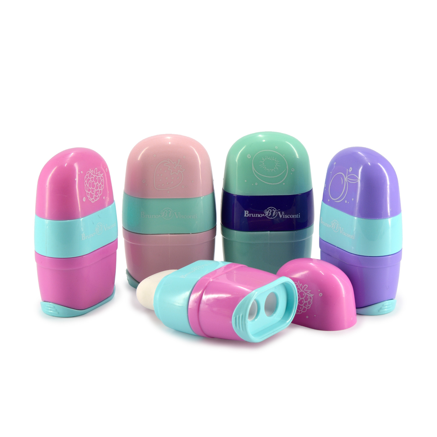 ТОЧИЛКА С КОНТЕЙНЕРОМ И ЛАСТИКОМ, 2 ОТВЕРСТИЯ "ФРУКТИКИ" (4 ВИДА)